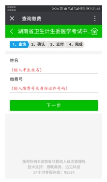 “湖南非稅移動繳費”微信公眾號支付??忌蜷_手機微信進入“湖南非稅移動繳費”公眾號中繳費頁面,輸入考生姓名+報名時的有效身份證件號碼信息,按手機端系統(tǒng)提示進行繳費。