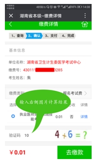 6.確認信息無誤后,輸入頁面下部圖片驗證碼計算結(jié)果,點擊“去繳款”;