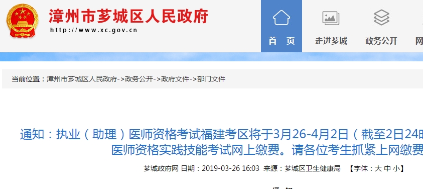 福建省漳州市關(guān)于2019年鄉(xiāng)村全科助理醫(yī)師薌城區(qū)實(shí)踐技能網(wǎng)上繳費(fèi)通知