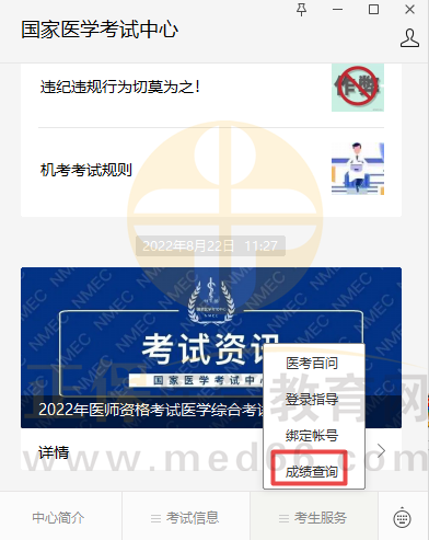2022年國(guó)家醫(yī)學(xué)考試中心微信公眾號(hào)成績(jī)查詢:姓名或者筆試準(zhǔn)考證+證件編號(hào)最后6位;