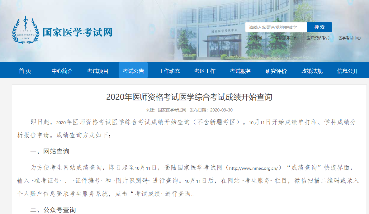 官網(wǎng)2020年執(zhí)業(yè)|助理醫(yī)師考試成績查詢?nèi)肟冢篽ttp://www.nmec.org.cn/