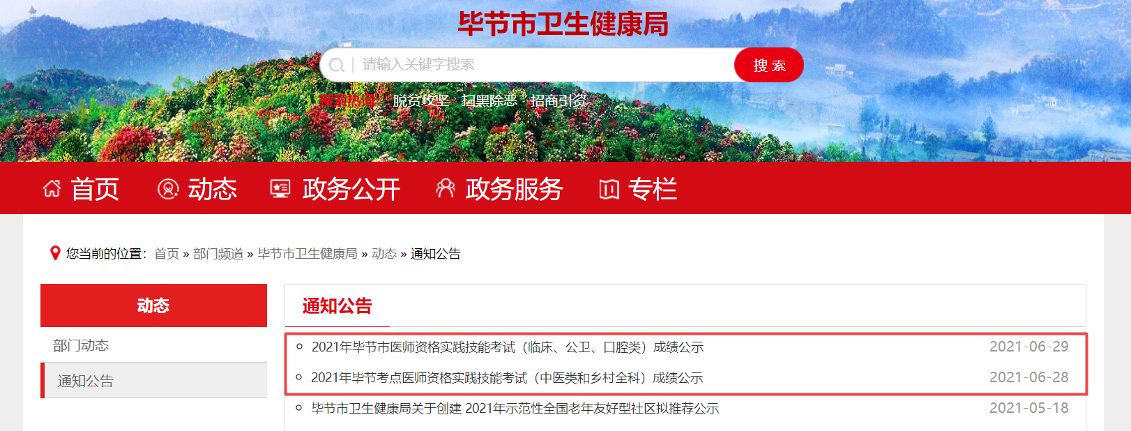 2021年畢節(jié)市醫(yī)師資格實踐技能考試(臨床、公衛(wèi)、口腔類)工作已結(jié)束,現(xiàn)將考試成績進行公示,公示時間為2021年6月29日至2021年7月5日。