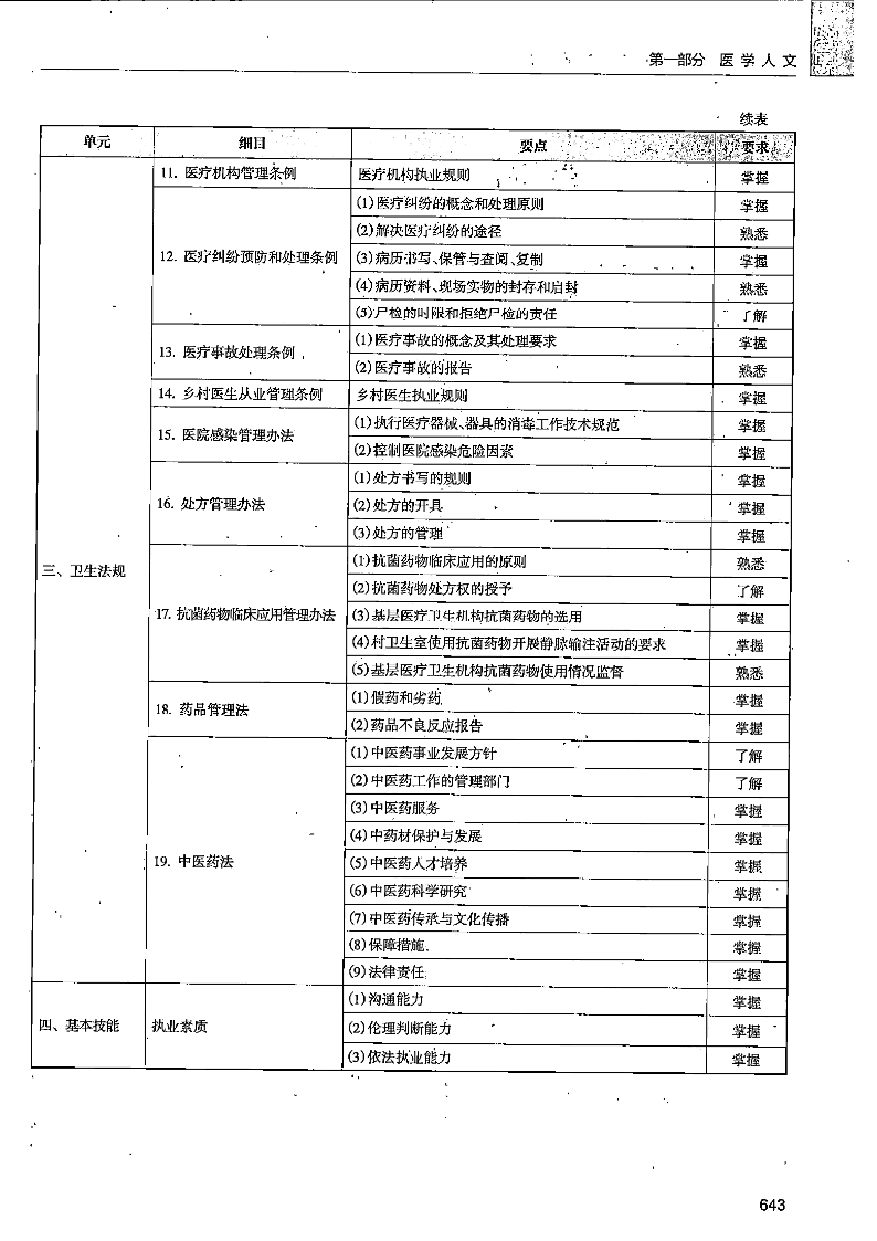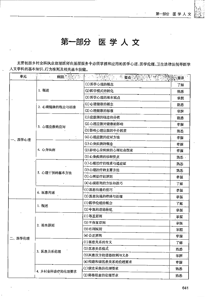 主要包括鄉(xiāng)村全科執(zhí)業(yè)助理醫(yī)師在基層服務(wù)中必須掌握和應(yīng)用的醫(yī)學(xué)心理、醫(yī)學(xué)倫理、衛(wèi)生法律法規(guī)等醫(yī)學(xué)人文學(xué)科的基本知識、行為準則及相關(guān)基本技能。