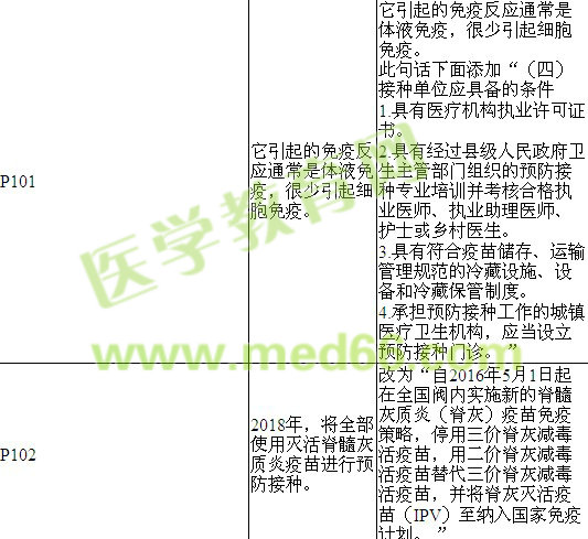 | P413預(yù)防甲、戊型肝炎的重點(diǎn):在于防止糞-口傳播,應(yīng)加強(qiáng)水源保護(hù)、糞便管理、食品及個(gè)人衛(wèi)生。 | P417預(yù)防甲、戊型肝炎的重點(diǎn):在于防止糞-口傳播,應(yīng)加強(qiáng)水源保護(hù)、糞便管理、食品,消滅蒼蠅及注意個(gè)人衛(wèi)生。 |