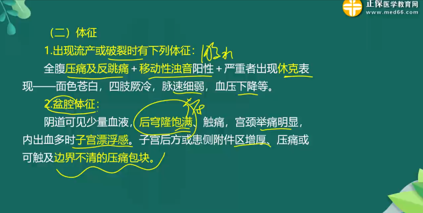 (1)出現(xiàn)流產(chǎn)或破裂時有下列體征: