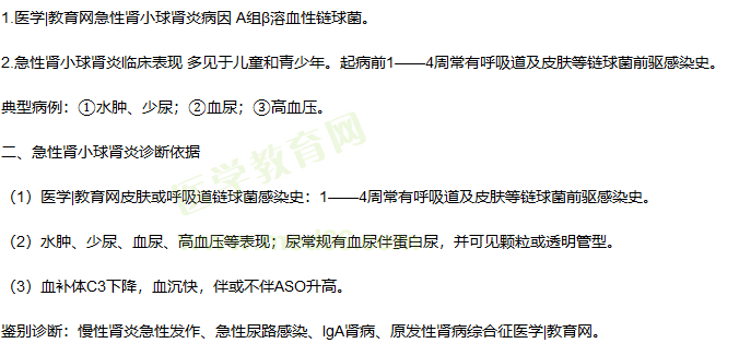急性腎小球腎炎是以血尿、蛋白尿、少尿、水腫、高血壓及氮質(zhì)血癥為主要臨床表現(xiàn),鏈球菌感染后為多見;臨床表現(xiàn)是該知識(shí)點(diǎn)的核心,一般診斷考核較多,對(duì)于病例分析題,仍是先確定診斷后,再提出處理措施。多考核A型題醫(yī)學(xué)|教育網(wǎng)。