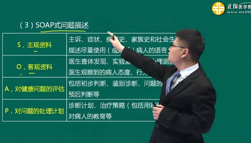 S,主觀資料 | 主訴、癥狀、疾病史、家族史和社會(huì)生活史等,描述盡量使用(或貼近)病人的語(yǔ)言 |