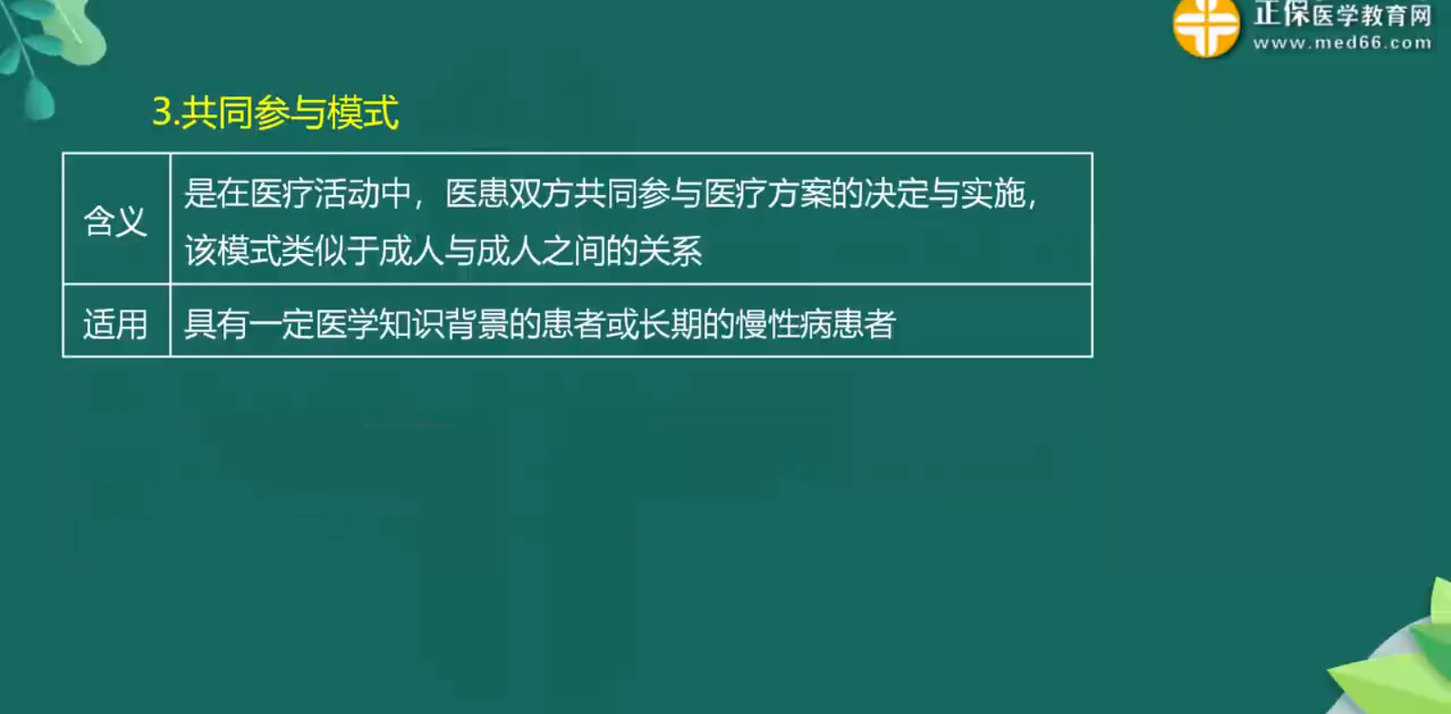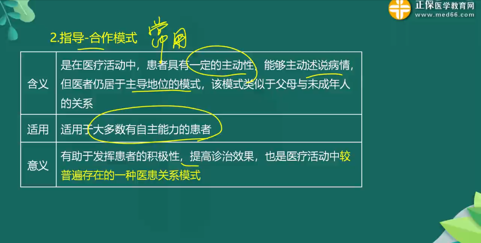 醫(yī)患關(guān)系模式包括主動-被動模式、指導(dǎo)-合作模式、共同參與模式。醫(yī)患雙方的道德權(quán)利與義務(wù)考試???,有時會以A2型題的形式考查大家,所以需要大家真正理解,在做題時才不會沒有頭緒。
