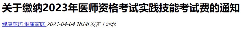 2023年河北考區(qū)醫(yī)師資格考試實踐技能考試繳費工作已經(jīng)開始,請考生于4月4日14:00-4月9日24:00前登錄國家醫(yī)學考試網(wǎng),繳納實踐技能考試費。