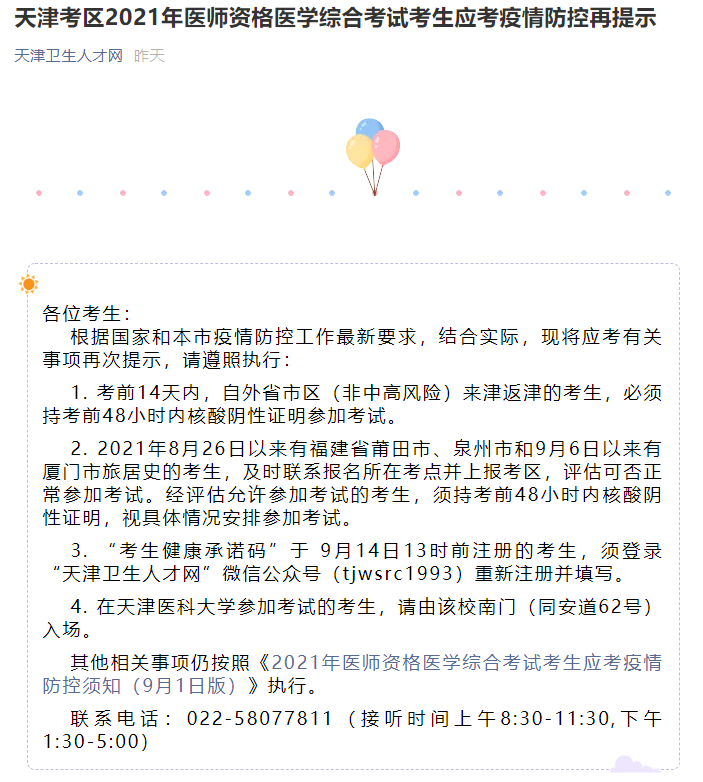 天津考區(qū)2021年醫(yī)師資格醫(yī)學(xué)綜合考試考生應(yīng)考疫情防控再提示