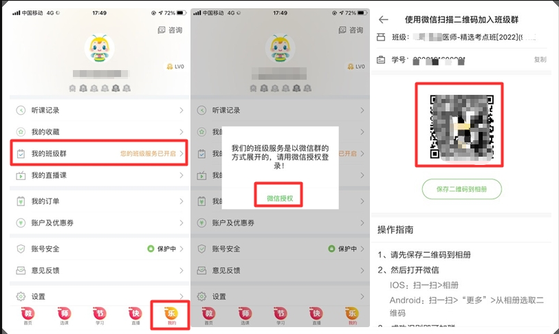 手機(jī)端:下載醫(yī)學(xué)教育網(wǎng)APP(下載鏈接>>),登錄之后,進(jìn)入“我的”,點(diǎn)擊“我的班級(jí)群”,會(huì)提示“微信授權(quán)”授權(quán)之后,即可進(jìn)入社群服務(wù)操作指南界面。可以查看詳細(xì)的操作說(shuō)明。