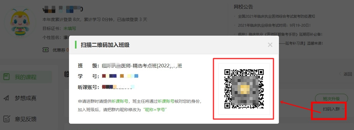 電腦端:購(gòu)課之后,登錄m.tymfj.cn,進(jìn)入我的網(wǎng)校我的家,點(diǎn)擊“掃碼入群”即可掃碼入群,添加班主任老師好友,提供聽(tīng)課賬號(hào),等待入群。審核通過(guò)之后會(huì)及時(shí)拉您入班級(jí)群,跟同班同學(xué)一起備考!精選考點(diǎn)班班次詳情>>