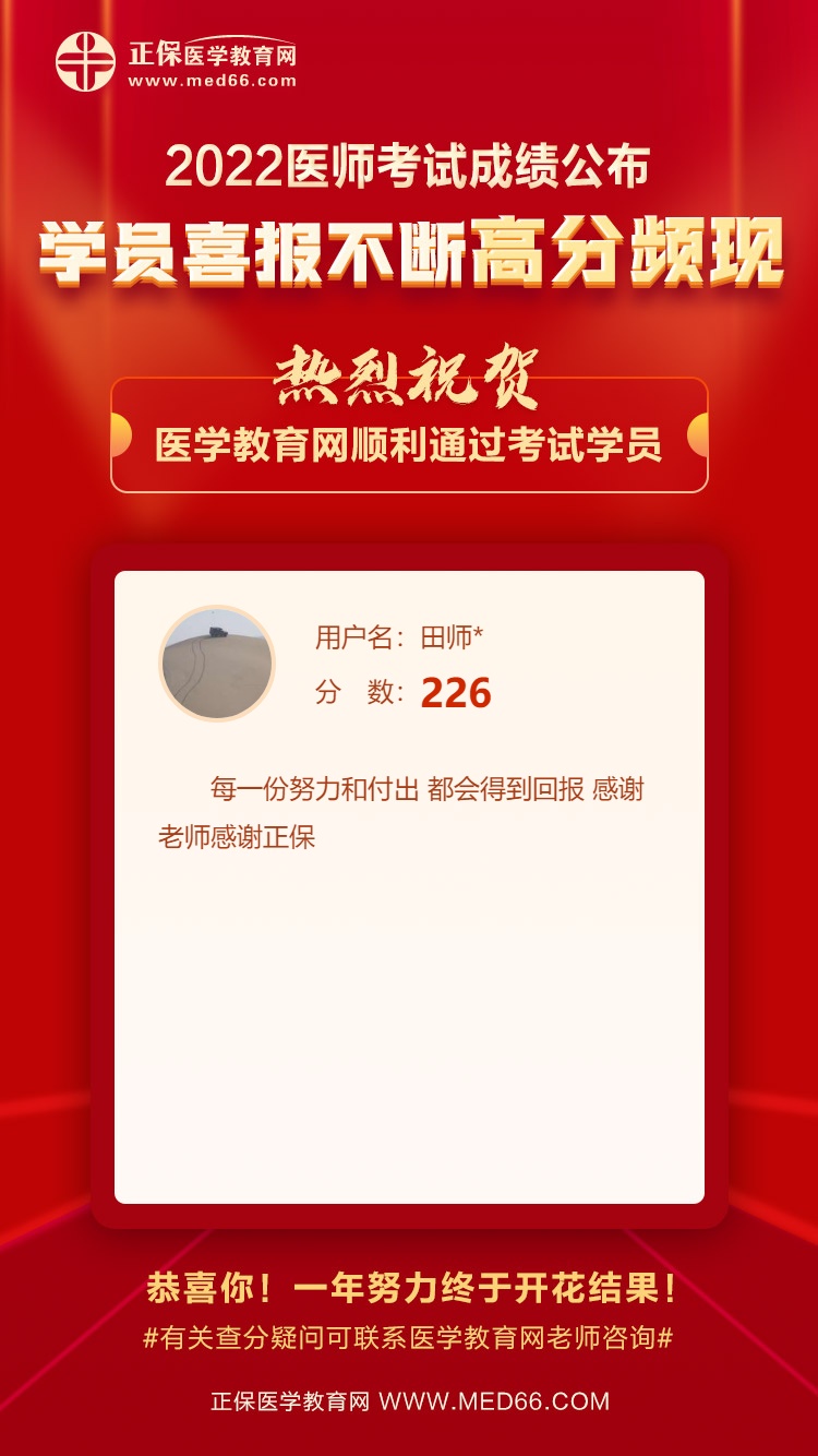 2022年醫(yī)師資格考試成績公布后,醫(yī)學(xué)教育網(wǎng)學(xué)員喜報不斷,高分頻現(xiàn)!在此醫(yī)學(xué)教育網(wǎng)小編熱烈祝賀各位順利通過考試的同學(xué)!同時也將大家成功的喜悅、備考心得一起分享給2023年考生。一起來看看吧!
