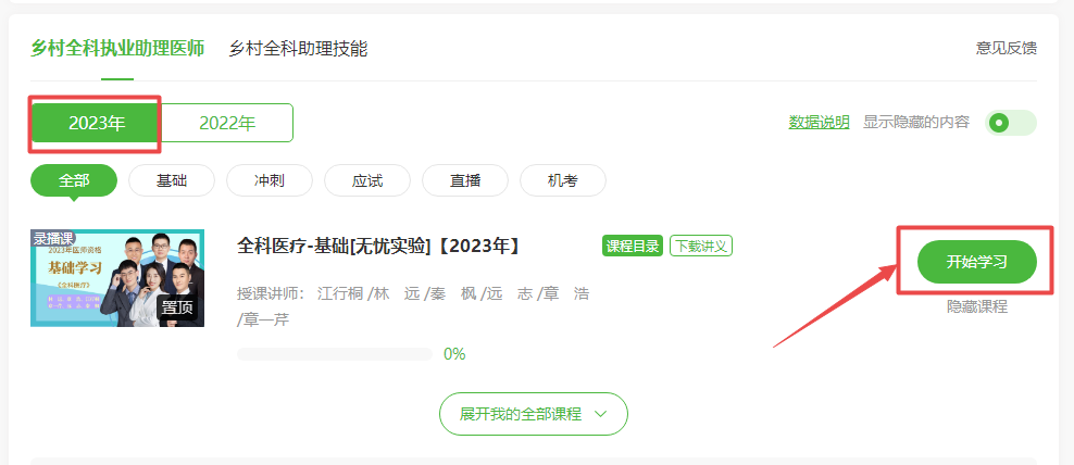 登錄學員代碼進入我的網(wǎng)校我的家,點擊“我的課程”,進入課程,選擇“2023年”,即可看到《醫(yī)全科醫(yī)療》課程,點擊開始學習即可。