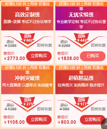 2021年鄉(xiāng)村全科助理醫(yī)師高效定制班、無憂實驗班、超值精品班、沖刺突破班、技能特色班85折優(yōu)惠可折上用券(課程折扣+秒殺直降券=巨劃算)