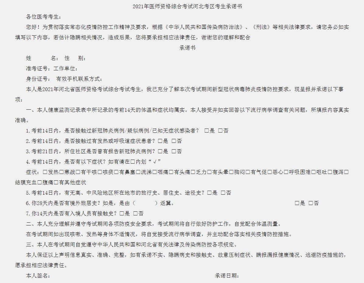 4.《2021年醫(yī)師資格綜合考試河北考區(qū)考生承諾書》(附件2);