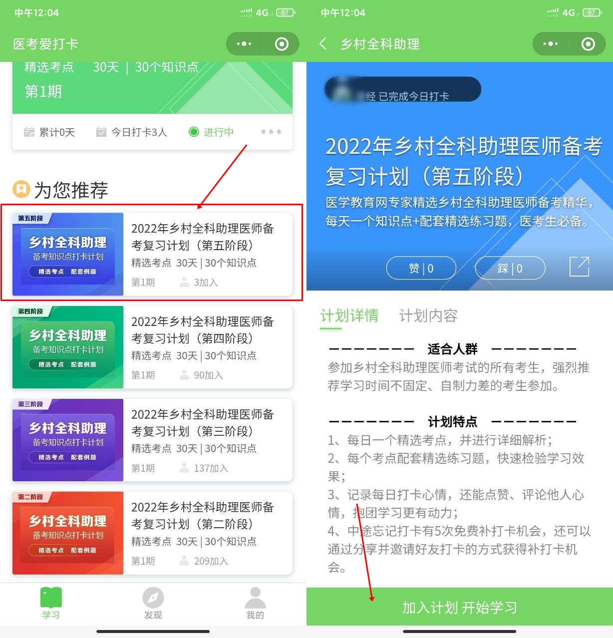 如鄉(xiāng)村全科助理醫(yī)師備考復(fù)習(xí)計(jì)劃(第五階段),然后點(diǎn)擊下方“加入計(jì)劃 開始學(xué)習(xí)”按鈕,開始正式進(jìn)入打卡學(xué)習(xí)。