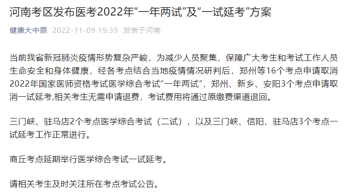 河南考區(qū)發(fā)布2022年鄉(xiāng)村全科助理醫(yī)師資格考試“延考”方案