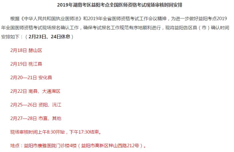 湖南益陽(yáng)市2019年鄉(xiāng)村全科助理醫(yī)師現(xiàn)場(chǎng)確認(rèn)時(shí)間安排