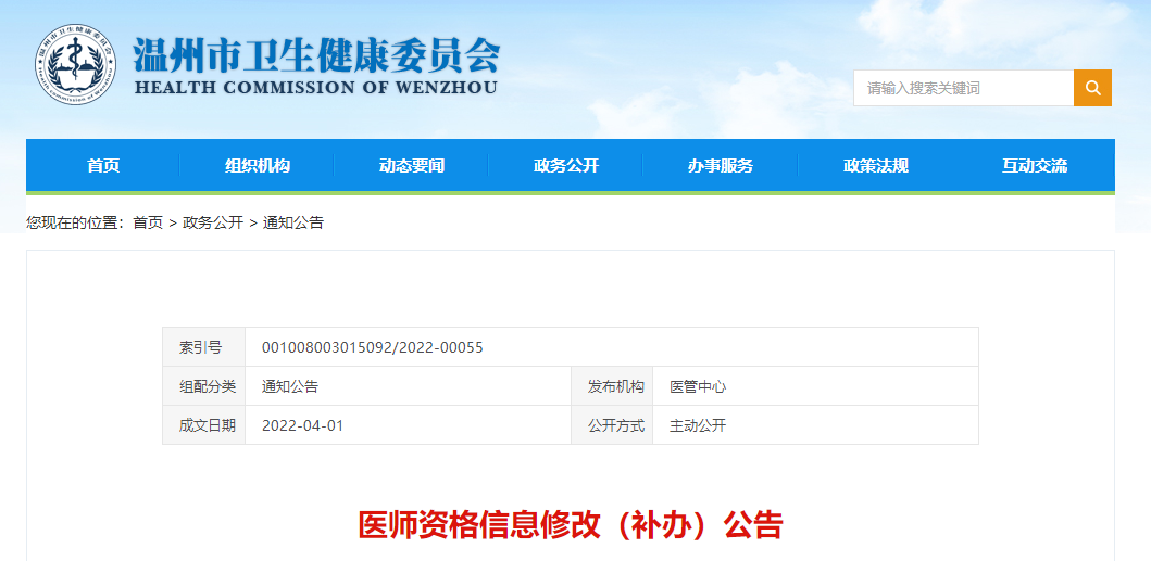 溫州市市級公辦醫(yī)院管理中心只能辦理在溫州考取醫(yī)師資格證書的信息修改和補辦業(yè)務。修改醫(yī)師資格信息流程復雜,請考生耐心等待。