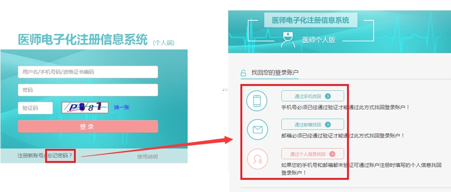 忘記密碼,您可以通過醫(yī)師個人端“密碼找回”功能申請找回。具體如下圖所示: