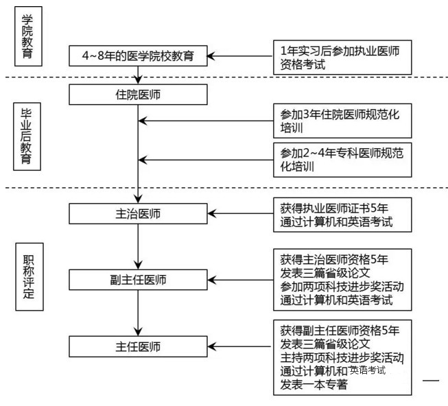 醫(yī)生除了接受這個(gè)定期的考核之外,還要每隔幾年按照:住院醫(yī)師、主治醫(yī)師、副主任醫(yī)師、主任醫(yī)師的序列根據(jù)個(gè)人學(xué)歷、工作年限、論文、科學(xué)進(jìn)步獎(jiǎng)活動(dòng)、專(zhuān)著、英語(yǔ)及計(jì)算機(jī)水平進(jìn)行職稱(chēng)評(píng)定。此外,根據(jù)一定的教學(xué)序列:助教、講師、副教授、教授,醫(yī)生也要參加評(píng)定一定的教學(xué)職稱(chēng)。