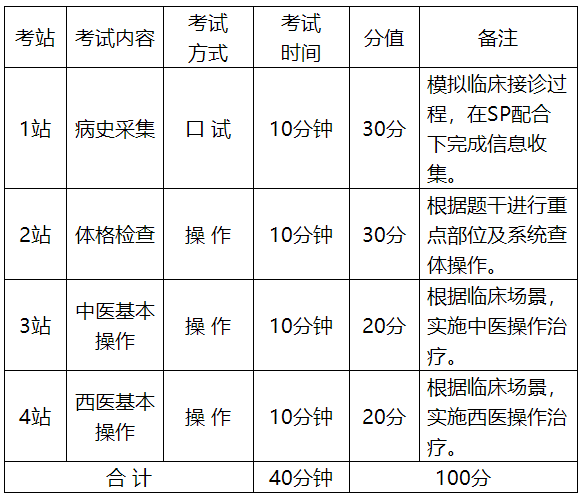 1.考試形式:客觀結構化臨床考核(Objective Structured Clinical Examination,以下簡稱“OSCE”),包括問診、操作、標準化病人(Standardized Patients,以下簡稱“SP”)配合。