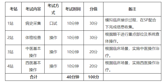 (1)考試形式:客觀結(jié)構(gòu)化臨床考核(OSCE),包括問(wèn)診、操作、標(biāo)準(zhǔn)化病人(SP)配合。
