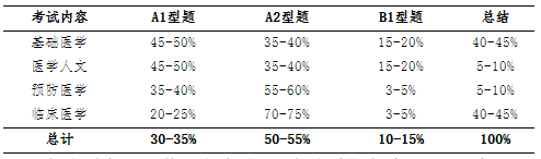 理論考試總題量為330道題(其中30題用于考試研究,不計(jì)入考生水平測(cè)試總成績(jī))。其中,基礎(chǔ)醫(yī)學(xué)占40-45%,醫(yī)學(xué)人文占5-10%,預(yù)防醫(yī)學(xué)占5-10%,臨床醫(yī)學(xué)占40-45%。