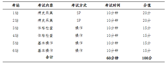 主要考查病史采集、體格檢查和基本操作技能,同時(shí)對(duì)溝通交流能力與人文關(guān)懷進(jìn)行評(píng)價(jià)。
