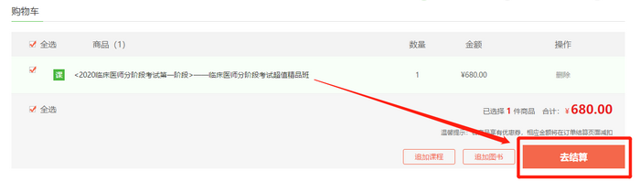 第二步:在購(gòu)物車(chē)內(nèi)確認(rèn)已選課程,確認(rèn)無(wú)誤后點(diǎn)擊“去結(jié)算”;