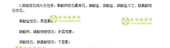 X線不能透過含鈣的物質(zhì),一般說來,大部分尿路結石都含有一定量的鈣(如草酸鈣、磷酸鈣、磷酸鎂銨結石等),都能在X線平片上顯示出來。對于一些不含鈣的結石(如胱氨酸、尿酸結石),X線平片上就不能顯示醫(yī)學|教育網(wǎng)。