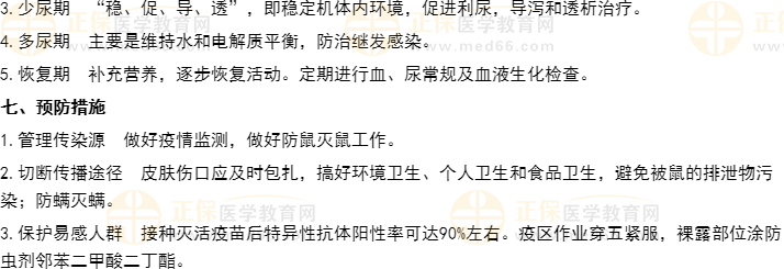 4.多尿期 一般出現(xiàn)在病程的9~14日。每日尿量超過3000ml,少尿期的癥狀好轉(zhuǎn)??砂l(fā)生脫水、低鉀血癥等,也可發(fā)生繼發(fā)性休克。多尿期的出現(xiàn)是由于循環(huán)血量增加,腎小球濾過功能改善,但腎小管重吸收能力尚未完全恢復導致的。