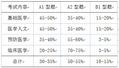 理論考試總題量為400題。其中,基礎醫(yī)學占40-45%,醫(yī)學人文占5-10%,預防醫(yī)學占5-10%,臨床醫(yī)學占40-45%.