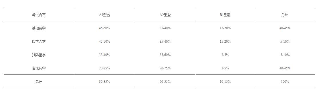 理論考試總題量為330題。其中,基礎醫(yī)學占40-45%,醫(yī)學人文占5-10%,預防醫(yī)學占5-10%,臨床醫(yī)學占40-45%。題型比例: