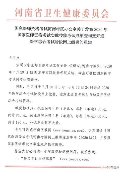 河南考區(qū)2020年醫(yī)師資格綜合筆試考試網(wǎng)上繳費時間:7月30日起