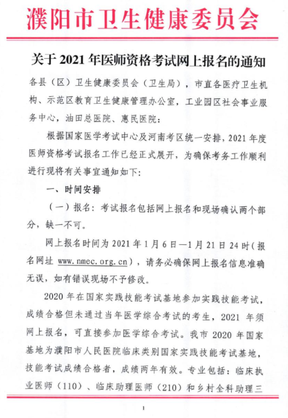 河南省濮陽(yáng)市衛(wèi)健委發(fā)布關(guān)于2021年醫(yī)師資格考試網(wǎng)上報(bào)名的通知