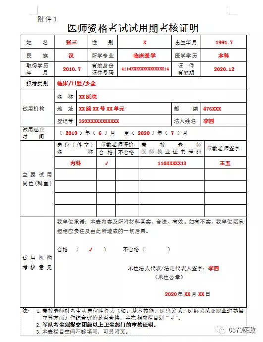 附件1、醫(yī)師資格考試試用期考核證明填寫(xiě)示例