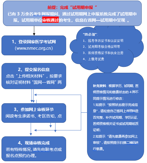 (二)未完整上傳省網(wǎng)信息的考生。網(wǎng)上現(xiàn)場審核提示為“請按狀態(tài)提示完善信息”,需依次補(bǔ)充所缺“試用期考核合格證明”、“學(xué)歷證明”和“助理醫(yī)師資格情況”等材料,上傳材料必須與國網(wǎng)填寫信息一致,內(nèi)容真實,圖片清晰。