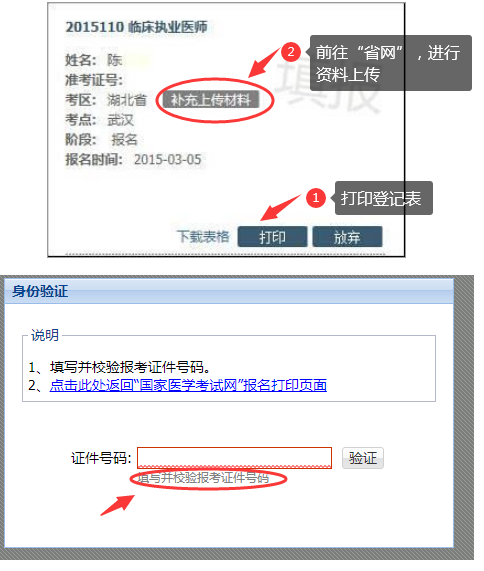(一)登錄國網(wǎng)。登陸國家醫(yī)學(xué)考試網(wǎng),確認(rèn)已填寫報考信息正確,是否與省網(wǎng)填寫內(nèi)容一致,確認(rèn)后點擊“上傳相關(guān)材料”將跳轉(zhuǎn)會至省網(wǎng),進(jìn)入省網(wǎng)前需填寫并效驗考生本人報考證件號碼。