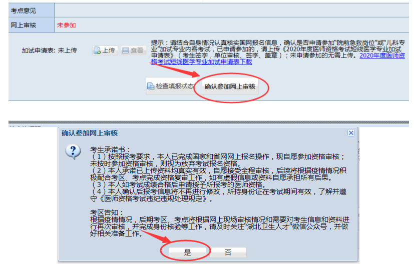 (二)完善省網(wǎng)信息。進(jìn)入省網(wǎng),認(rèn)證核對試用期考核合格證明、完整填寫學(xué)歷證明、助理醫(yī)師資格情況和實踐技能繳費(技能免考考生可免繳費技能費用,僅針對去年參加湖北考區(qū)實踐技能考試通過的考生,去年外省國家級基地技能通過考生需先繳費后考區(qū)統(tǒng)一退費)等相關(guān)信息后,方可進(jìn)行“確認(rèn)參加網(wǎng)上審核”環(huán)節(jié)。請仔細(xì)閱讀《考生承諾書》和《考區(qū)告知》后,再點擊“是”完成網(wǎng)上現(xiàn)場審核環(huán)節(jié),點擊“否”則無法完成參加網(wǎng)上審核,視為放棄考試報名資格。對審核中發(fā)現(xiàn)“利用偽造證件、證明及其他虛假材料報名的”,作出“取消當(dāng)年考試資格,并取消下一年度起兩年內(nèi)參加醫(yī)師資格考試資格”的處理。
