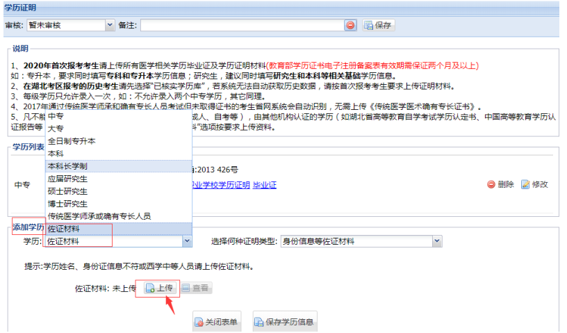 2.學(xué)歷證明和助理醫(yī)師資格情況上傳:要求具體填報可見湖北考區(qū)2021年醫(yī)師資格考試公告。上傳其他佐證材料的可在“學(xué)歷證明”項添加,如下圖: