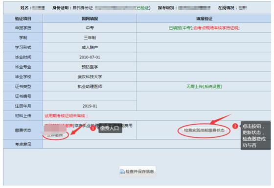 (三)未完成實踐技能繳費的考生。網(wǎng)上現(xiàn)場審核提示為“請先繳費再參加網(wǎng)上審核”,在繳費狀態(tài)欄點“立即繳費 ”按鈕按提示完成實踐技能考試費用繳納,未按時完成費用繳納的考生視為放棄報名。