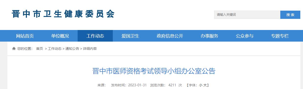 根據(jù)《中華人民共和國醫(yī)師法》、《醫(yī)師資格考試暫行辦法》和山西省醫(yī)師資格考試領(lǐng)導(dǎo)小組辦公室公告(晉醫(yī)考辦〔2023〕1號)規(guī)定,現(xiàn)將我市(晉中考點(diǎn))2023年醫(yī)師資格考試工作有關(guān)事項(xiàng)公告如下: