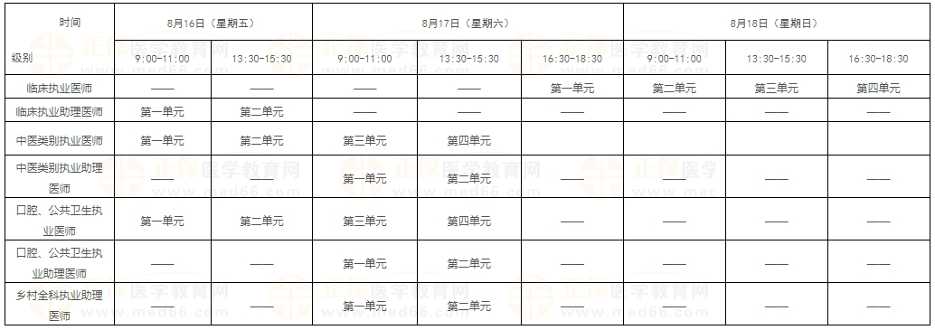 考試實(shí)行計(jì)算機(jī)化考試,軍隊(duì)現(xiàn)役人員加試軍事醫(yī)學(xué)、院前急救崗位和兒科專業(yè)加試相應(yīng)內(nèi)容。統(tǒng)一考試時(shí)間如下: