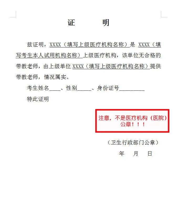 須用上級醫(yī)療機構的帶教老師資格證與執(zhí)業(yè)證復印件并加蓋公章,考核證明需加蓋上級機構和本人所在單位公章各一個(兩個章),并出具醫(yī)聯(lián)體證明,并加蓋衛(wèi)生行政部門公章,無醫(yī)聯(lián)體證明的需填寫附件《上級醫(yī)療機構出具帶教老師的證明》加蓋衛(wèi)生行政部門公章,附件下載方式見文末;