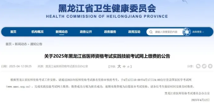 關(guān)于2025年鶴崗考點(diǎn)醫(yī)師資格考試實(shí)踐技能考試網(wǎng)上繳費(fèi)的公告