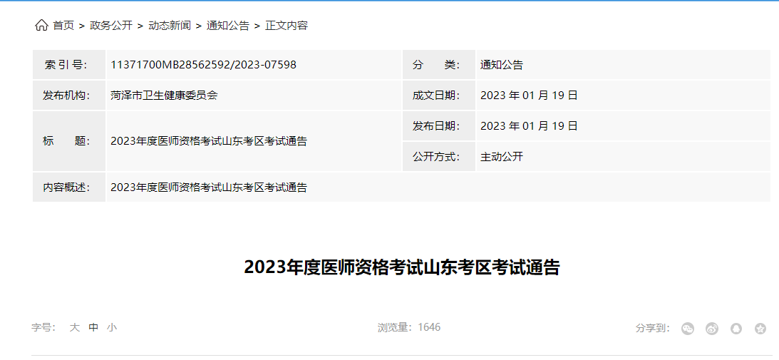 2023年度醫(yī)師資格考試山東考區(qū)考試通告
