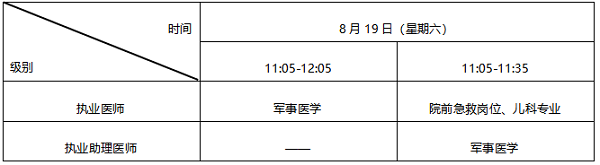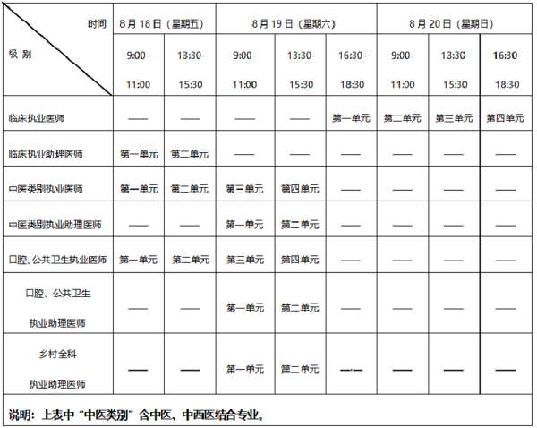 考試(藏醫(yī)除外)實行計算機(jī)化考試。中醫(yī)類別藏醫(yī)專業(yè)實行紙筆考試。軍隊現(xiàn)役人員加試軍事醫(yī)學(xué),院前急救崗位和兒科專業(yè)加試相應(yīng)內(nèi)容。除中醫(yī)類別(藏醫(yī))外,執(zhí)業(yè)醫(yī)師合格分?jǐn)?shù)線為360分,執(zhí)業(yè)助理醫(yī)師合格分?jǐn)?shù)線為180分??荚嚂r間如下: