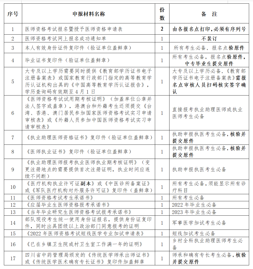 考生根據(jù)自身報考情況按要求提交以下材料。材料按照序號順序裝訂整齊。復印件要求完整、清楚,提交的復印件一律使用A4紙張,其原件均由所在的醫(yī)療機構及各報名點核驗,并在復印件上加蓋所在醫(yī)療機構公章。